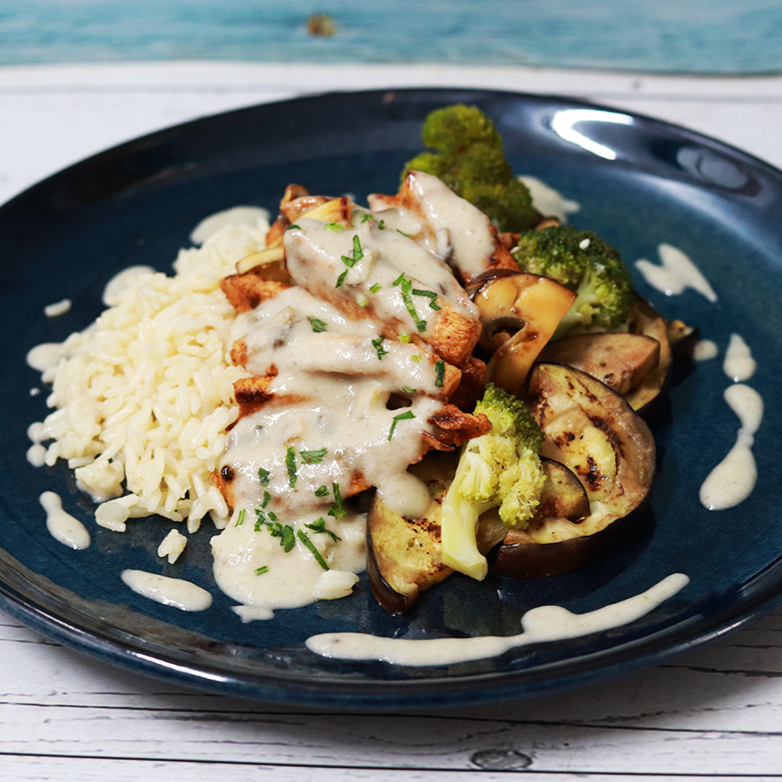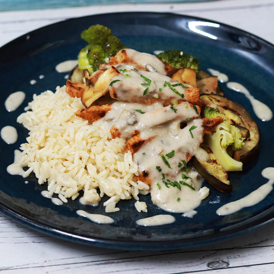 Tiras de Frango com molho de cogumelos e leite de coco, acompanhado por arroz basmati aromatizado e por brócolos e beringela assada.