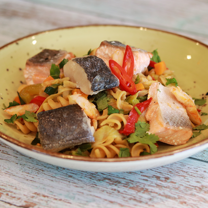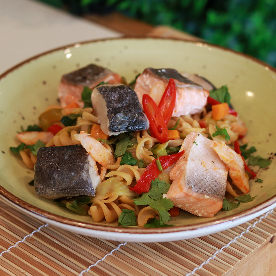 Massada integral de fusilli com Salmão e Pescada, acompanhada por mix de pimentos, tomate, cenoura, couve, coentros e malagueta.