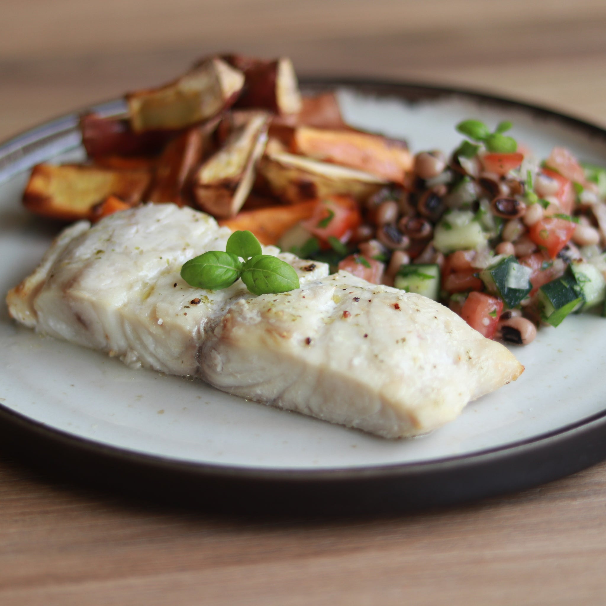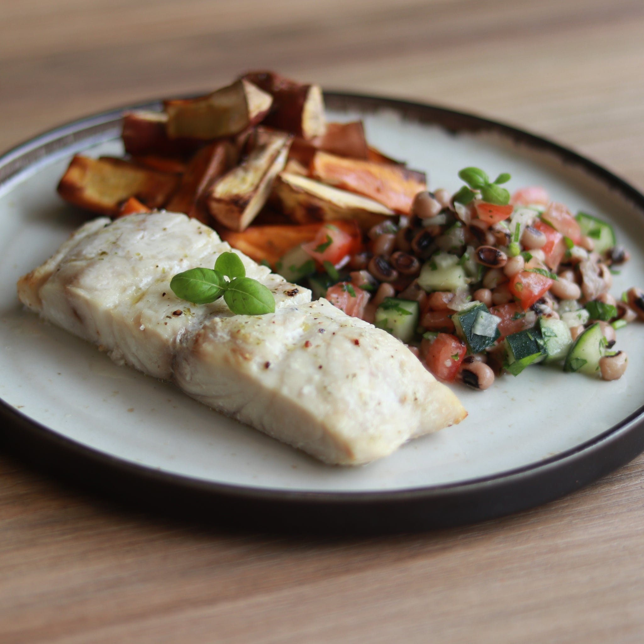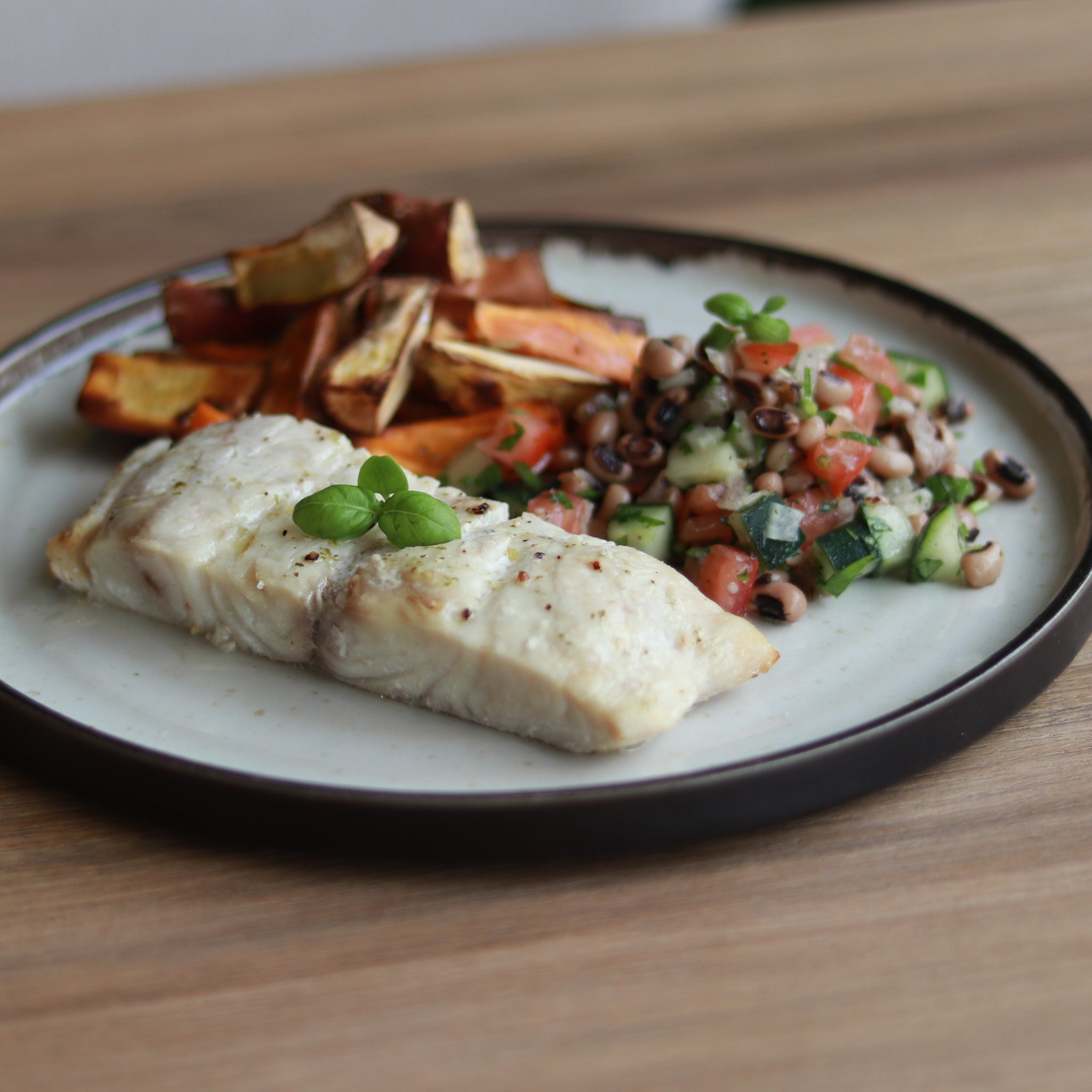 Perca assada no forno, acompanhada de batata doce assada e por salada de feijão frade, tomate, pepino, cebola, limão e salsa.