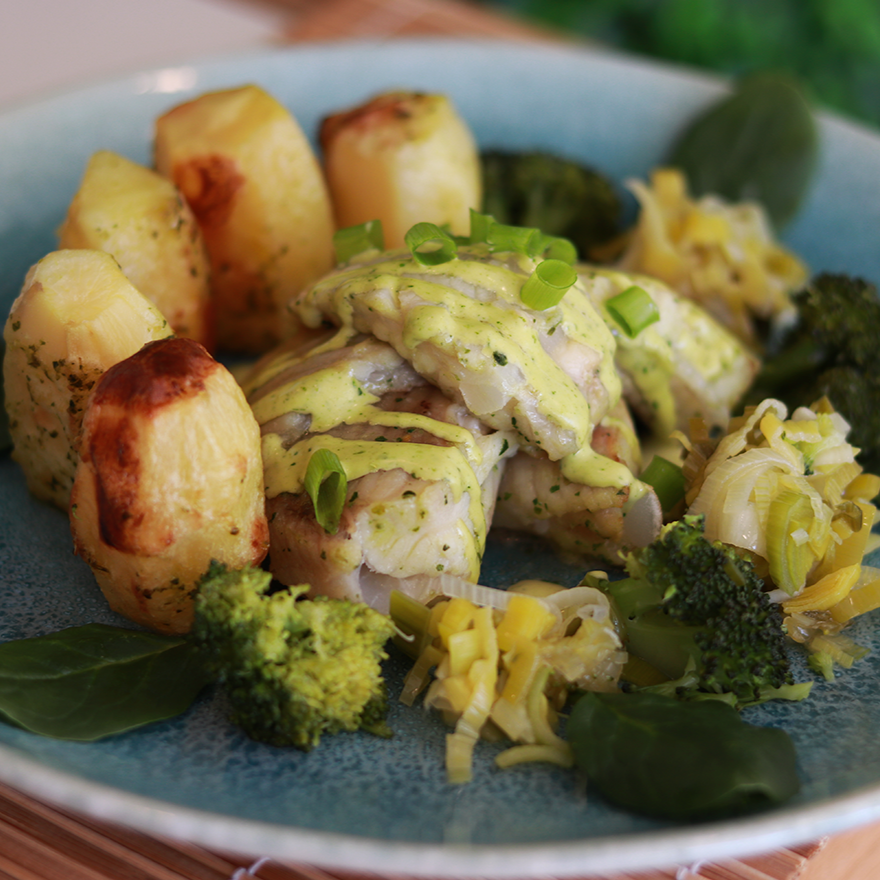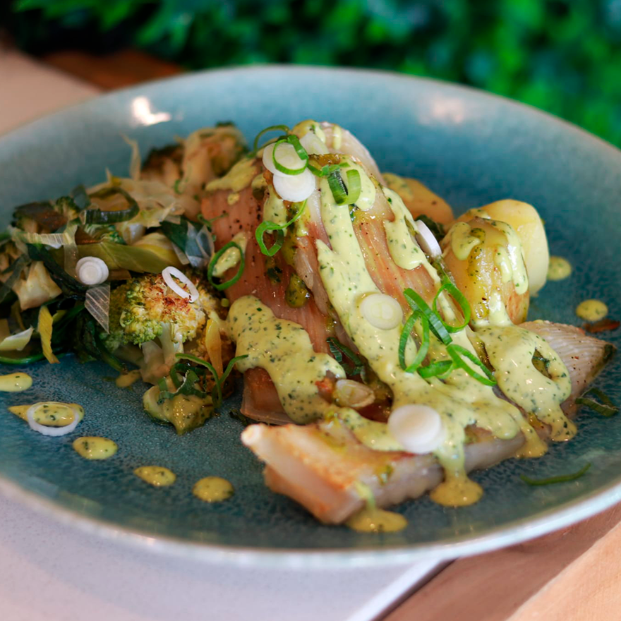 Raia assada no forno com emulsão de alho, salsa e cebolete, acompanhada por batatinha nova salteada ao alho, e salteado de brócolos, alho francês e espinafres.