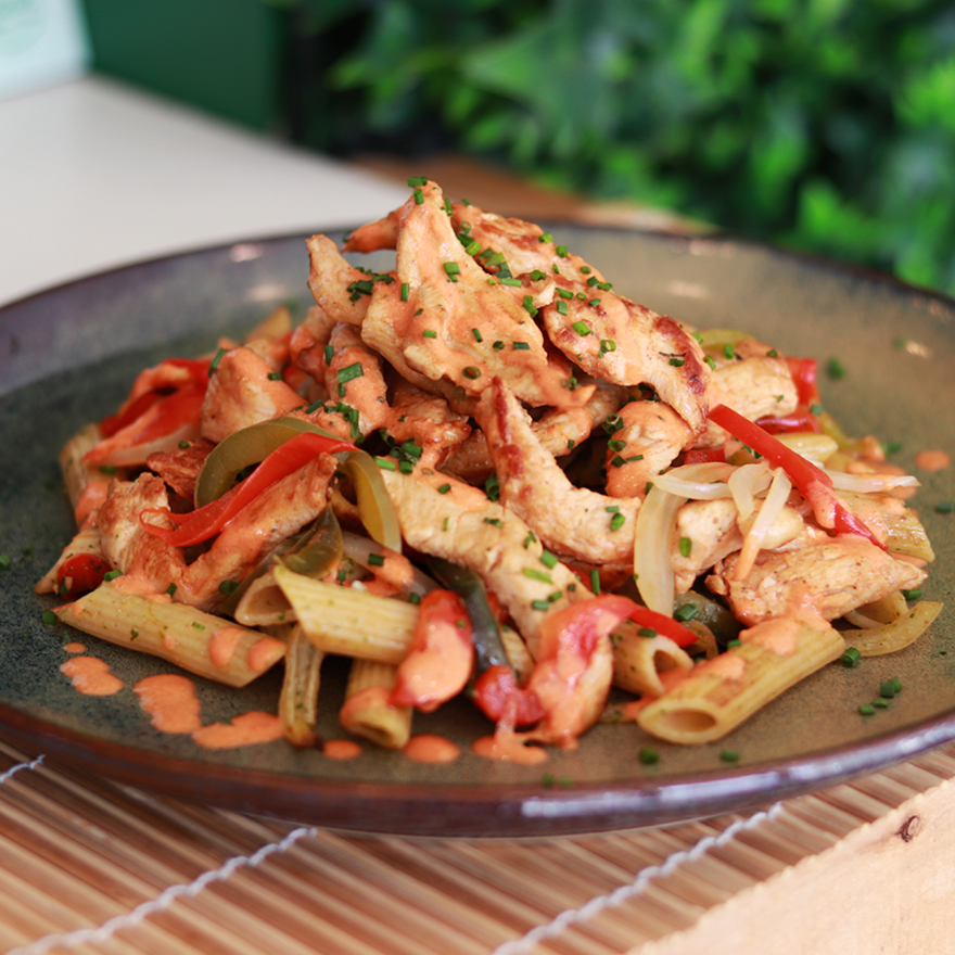 Tiras de Perú salteadas com molho de pimentos fumados, acompanhadas por cebola, pimentos, e massa penne integral de aveia.